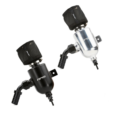 It's no secret that forced induction engines create an abundance of oil/gas/condensation waste. Due to emissions laws & such, this waste has to be recycled back through the engine & “burned off”. This oily mess is the “ messy film” you find caked to your charge tubes, turbo inducer blades, and inside the intercooler. Not only can these gasses and liquids create tuning headaches by skewing the air fuel ratio, they can also increase the chances of detonation ( oil & condensation do not combust well). The RPM SxS Catch Can’s job is to collect this oily mess so that it can be manually drained later on. All necessary hardware to cap off your factory breather & completely install the catch can are included!