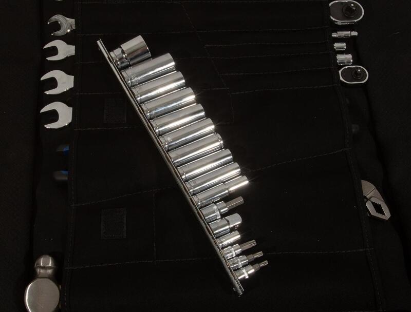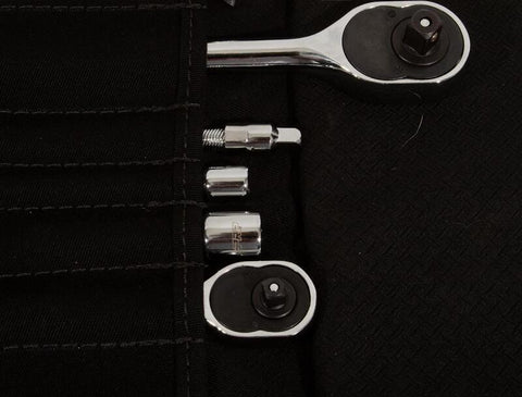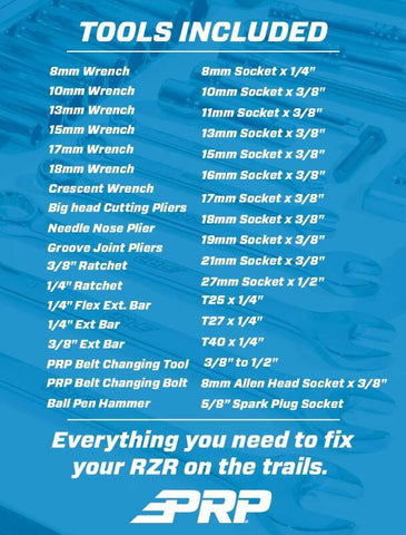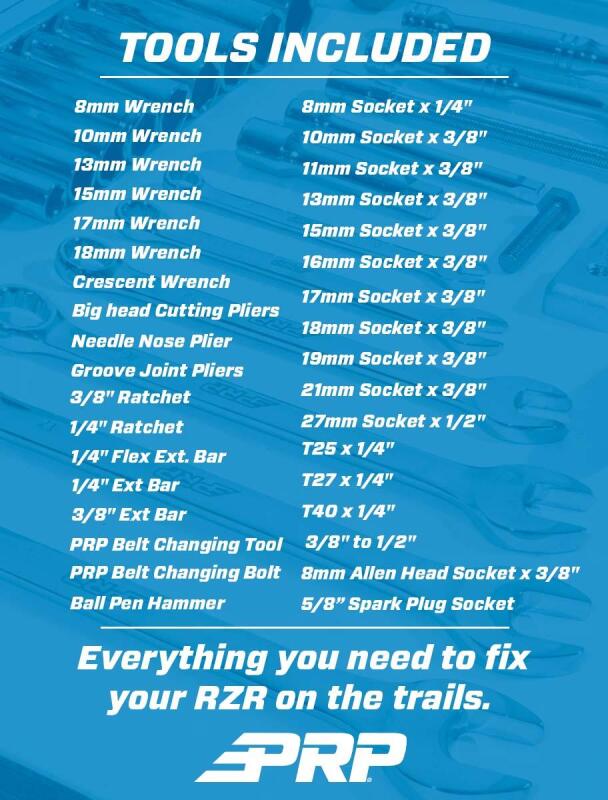 PRP's Polaris RZR Roll-Up Tool Kit provides everything you need to fix your RZR out on the trail. This 38-piece kit includes a selection of high-quality ratchets, sockets, wrenches, extension bars, pliers, and a ball peen hammer. We have hand-picked the tools most commonly needed when working on a Polaris RZR so you'll have the essentials that you need! Made from extremely durable twill material, the Polaris RZR Roll-Up Tool Kit makes it easy to keep everything neat and organized. The bag is made from extremely durable twill material, features heavy duty buckles, and has an easy to carry grab handle. A zippered pocket holds all the sockets you'll need and any other tools you want to bring with you. The tool bag can be mounted, or stored securely inside the vehicle. The roll-up style bag makes it quick and easy to grab out of the vehicle when you need it, and the tools inside don't make noise when bouncing around the trails. This kit also comes with PRP’s RZR Belt Changing Bolt for Turbo, Turbo S, RS1, PRO XP, PRO R, PRO S and Turbo R’s. Rather than using the L shaped clutch wrench that’s included in the stock tool kit (where you have to spin it by hand a thousand times), you can simply insert this hardened bolt, and use a ratchet (or impact) to tighten it down in seconds. The bolt holds the secondary clutch open, so you can quickly and easily change a belt in seconds, rather than minutes Don't get caught out on the trail unprepared. PRP's Roll-Up Tool Kit has everything you need to get your RZR going! Plus, each tool also includes a Limited Lifetime Warranty! Testimonial "This tool burrito is the product I end up using the most, and has pretty much everything you need to work on a RZR. I know that, because I've broken almost everything on a RZR." - Aaron Vehicle Fitment Polaris RZR 200 / 570 / 800 / 900 / XP1000 / Turbo / Turbo S / RS1 / PRO XP / PRO R / PRO S / Turbo R / Trail / EXPEDITION Kit Includes 1- Flat Head screwdriver - Hose clamps 1- Groove jo