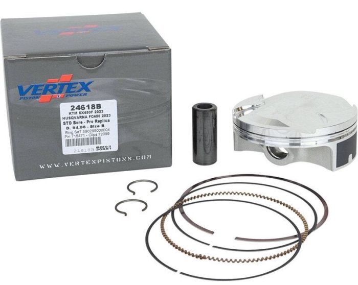 DescriptionVertex Forged Replica Piston KitFits Models450 SMR (23); 450 SX-F (23-24); 450 SX-F Factory (22-23); 450 XC-F (23-24); FC 450 (23-24); FC 450 Heritage Edition (23); FC 450 Rockstar Edition (23); FS 450 (23); FX 450 (23); MC 450 F (24)SpecsCompression Ratio13.1:1Cylinder Diameter95 mmDisplacement450 ccPiston Diameter94.960mm