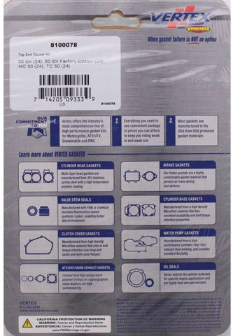 DescriptionVertex Top End Gasket KitFits Models50 SX (24-25); 50 SX Factory Edition (24); MC 50 (24-25); TC 50 (24-25)